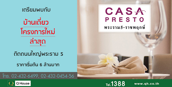 บริษัท ควอลิตี้ เฮ้าส์ จำกัด (มหาชน) เปิดจองโครงการ คาซ่า เพรสโต้ พระราม 5-ราชพฤกษ์ บ้านเดี่ยวโครงการใหม่ล่าสุด ติดถนนใหญ่พระราม 5 ราคาเริ่มต้น 6 ล้านบาท ผู้ที่สนใจสามารถลงทะเบียนเพื่อรับข้อมูลข่าวสารได้แล้ววันนี้